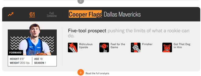 这场比赛之前,美国媒体The Ringer评选了25-26赛季联盟百大球星,没想到新科状元弗拉格直接排在了第61的位置上,就冲他的天赋他就已经碾压了多位NBA现役球员了?这个排名很明显虚高。