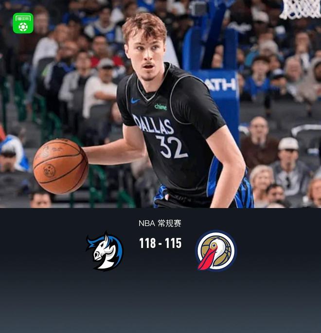 北京时间11月22日,NBA常规赛季中NBA杯小组赛达拉斯独行侠主场迎战新奥尔良鹈鹕。独行侠上半场进攻低迷落后两位数,半场独行侠49-63鹈鹕,下半场独行侠展开反扑,最后时刻鹈鹕错失绝平三分,最终独行侠118-115鹈鹕。