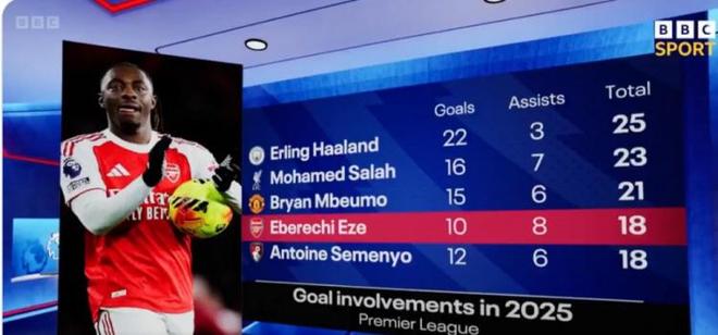 据BBC统计,埃泽今年英超参与18粒进球,仅少于哈兰德、萨拉赫、姆伯莫。